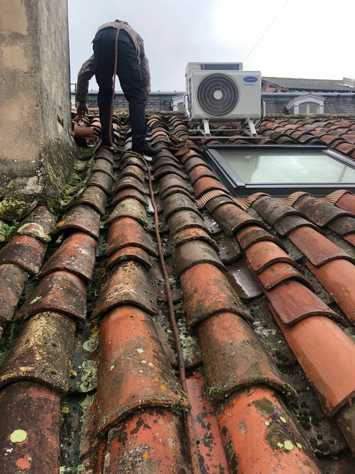 Les tuiles canal, souvent anciennes, peuvent se déplacer avec le temps et provoquer des infiltrations. Pour y remédier, nous réalisons un remaniage de toiture, qui consiste à repositionner et fixer les tuiles si nécessaire, afin d’assurer leur stabilité et éviter tout risque de glissement.