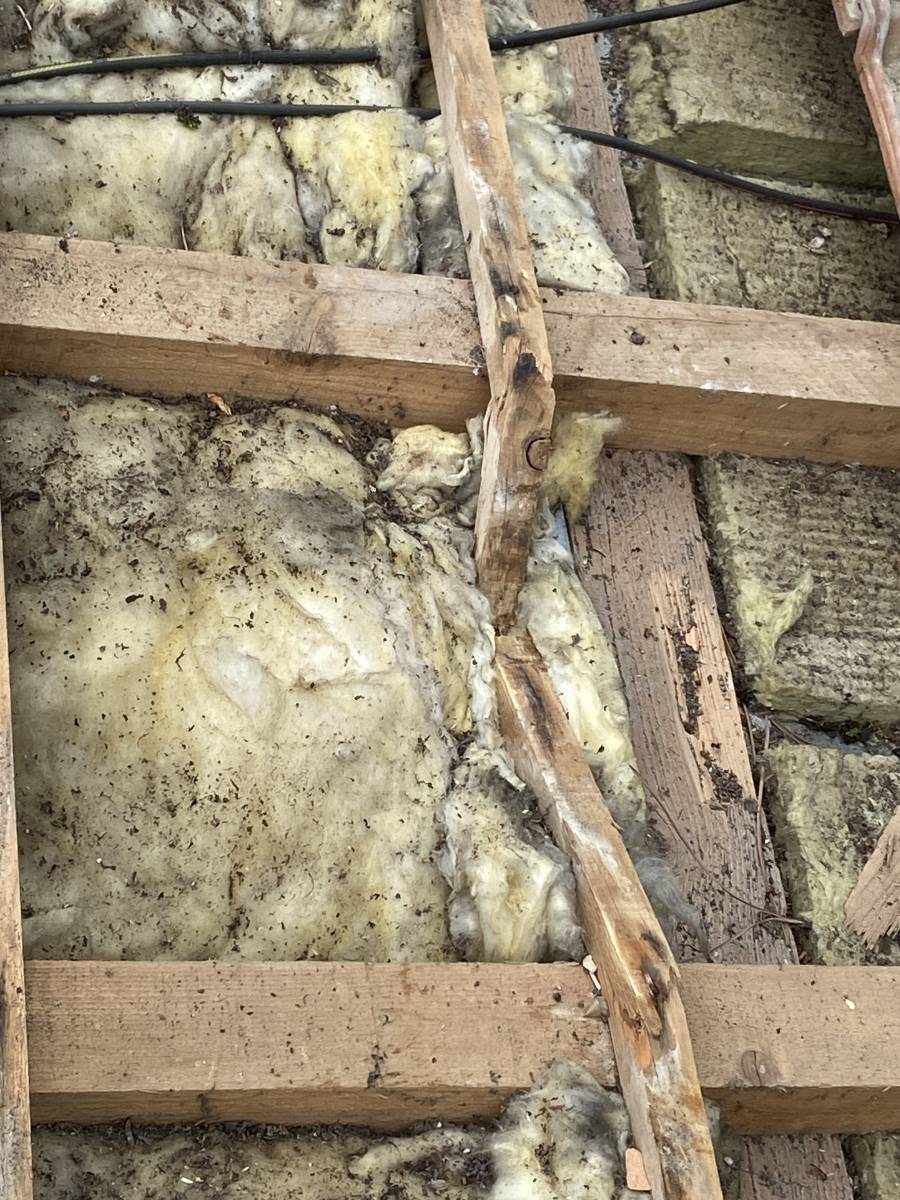 En montant sur le toit, nous avons rapidement diagnostiqué l’origine du problème : des liteaux abîmés par l’humidité prolongée et envahis par des débris végétaux. Comme on le voit sur la première photo, certains liteaux étaient fissurés, fragilisant l'ensemble de la structure et mettant en péril l'isolation. L’isolant, comprimé et détérioré, laissait passer l'humidité, réduisant considérablement l’efficacité thermique de la toiture.